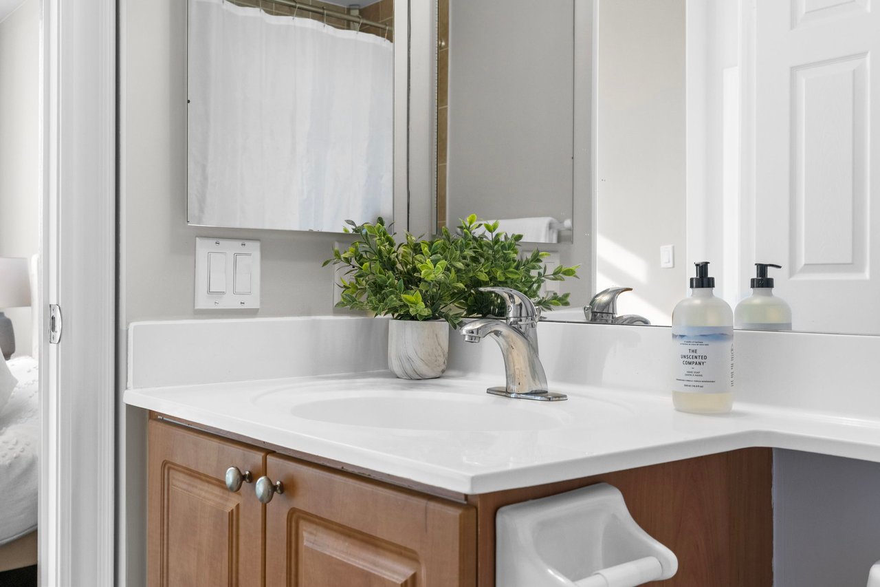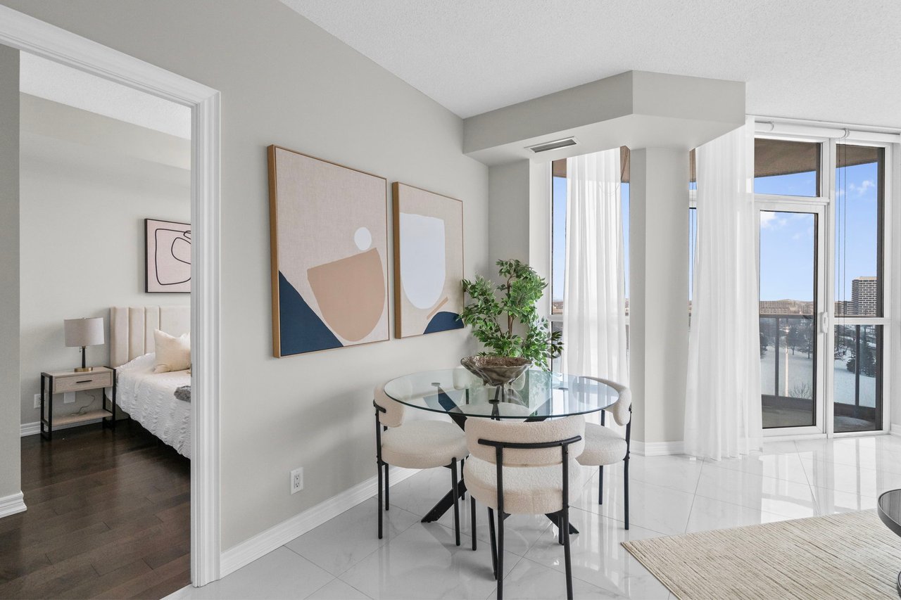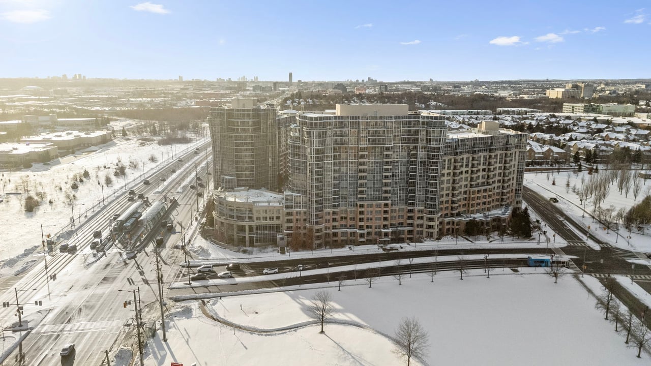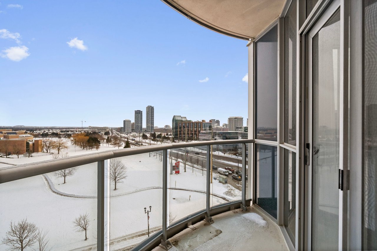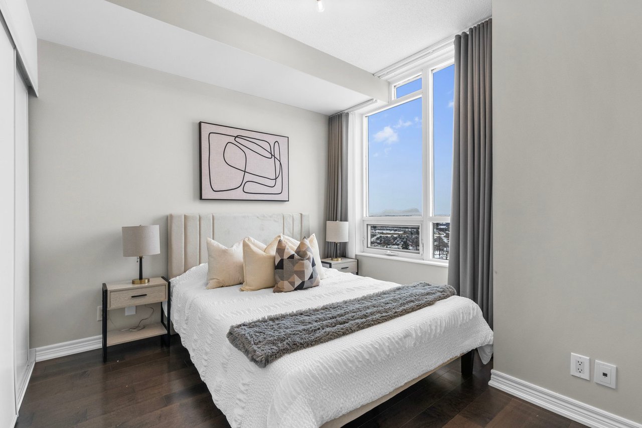 Bright and spacious corner suite in the heart of Downtown Markham offering approximately 973 sq ft of well-designed living space. This 2-bedroom plus den, 2-bathroom residence features a highly functional split layout with clear separation between living, dining, and bedroom areas, ideal for professionals, small families, or downsizers seeking space without compromise. Enjoy a highly desirable southeast exposure with abundant natural light throughout the day. Corner positioning provides additional windows, excellent airflow, and open views overlooking the park, with partial water views and city lights in the evening. The private balcony faces outward, offering a peaceful and open outlook. The interior was extensively updated around 2017, including ceramic flooring throughout the main living areas, refreshed finishes, window coverings, and a renovated kitchen with a custom color palette, ample storage, and a functional layout. A notable upgrade includes professional soundproofing installed beneath the flooring throughout the unit, providing an impressive IIC 78 sound insulation rating for enhanced comfort and privacy. The den works perfectly as a home office or flexible living space. Bedrooms are generously sized with closets and excellent natural light, including a bright primary bedroom with corner exposure. Includes one underground parking space. Professionally managed building with 24-hour concierge, indoor pool, gym, sauna, guest suites, golf simulator, and visitor parking. Steps to restaurants, cafés, transit, and civic amenities. Minutes to Highway 404, Highway 407, Unionville GO Station, shopping, and top-ranked schools. A rare opportunity to own a bright, quiet, and well-laid-out corner unit in a prime Downtown Markham location.